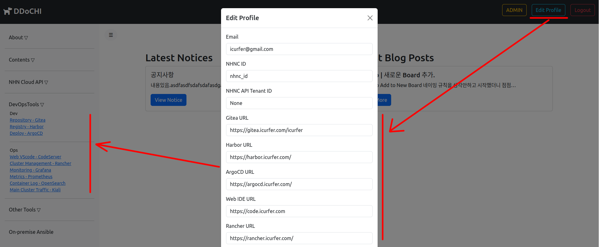 아래 컴포넌트들이 배포 되어있다면, 로그인 후 Edit Profile을 이용하여 웹콘솔 링크를 입력하여 사용합니다.
